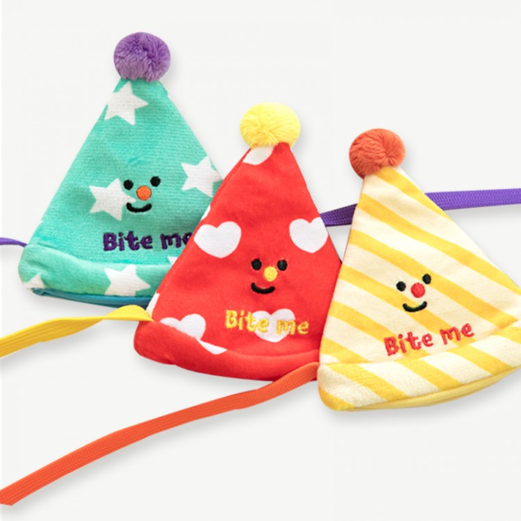Happy Birthday or any big day for celebration! Any time can be party time if you'd like to! This toy set contains three happy party hat toys for your pup and her other little furry friends! It's the pawfect time to party and have some fun! They even have squeakers inside and can be used as nosework toy to hide your pup's favorite snack, too. It's fun to play with even after the big party. The string helps your furry friend to wear them tight and fit.