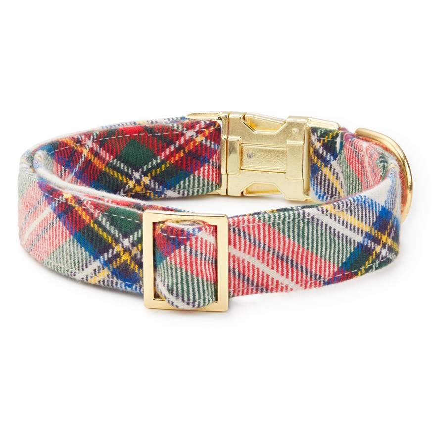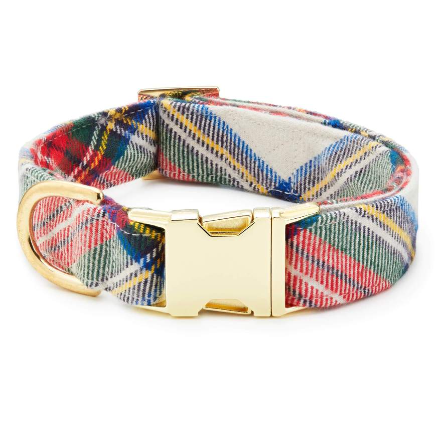 This classic plaid flannel collar features shades of red, green, yellow and blue on an ivory background.