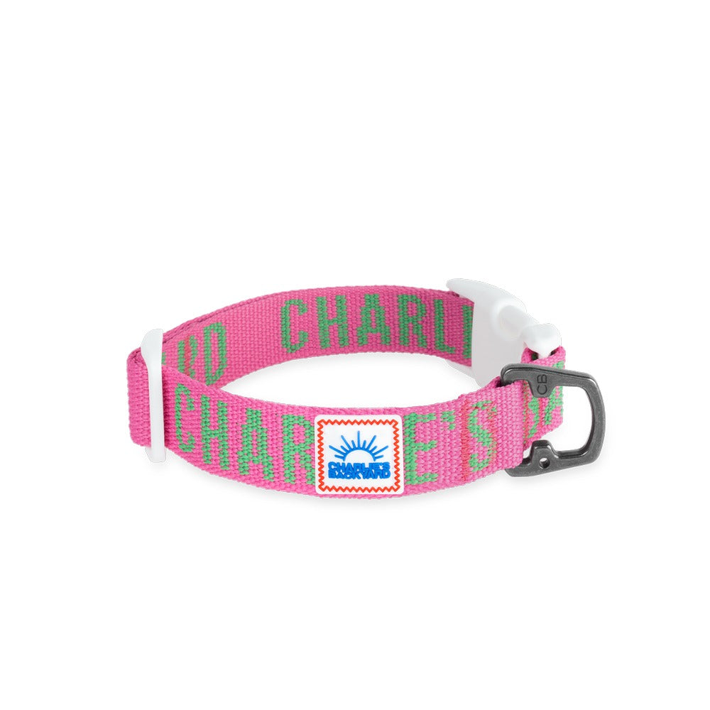 The retro themed trip collar with lettering jacquard webbing from Charlie's Backyard is here. The logo engraved D-ring is designed to maintain the proper angle at all times, allowing quick connection at any time, and a small hole is added to allow name tag attachment. The collar is made of lightweight material so your pup will not feel burdened. It also has a wider width so more comfortable for you dog to wear. The sturdy bracket and 4-points lock make sure the collar is secure and safe for all breeds.