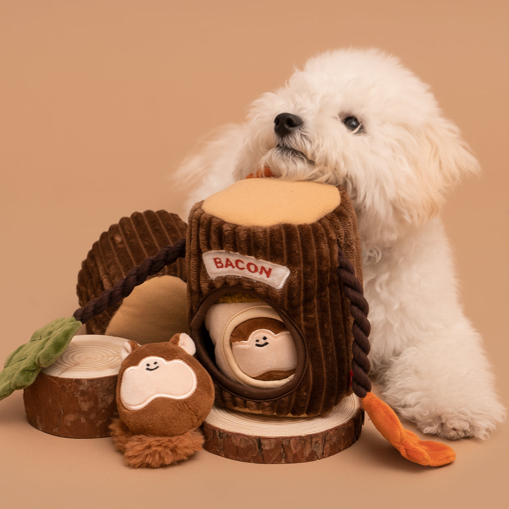 Are your pups crazy about squirrels and now is the time to hunt! Of course not the real ones, but the lovely, adorable and squeaky plushie from Bacon. The cute squirrel is hiden inside an acorn that is inside a tree hole, for some real challenge of nose work games. The added crinkle leaves are forming a tug toy and bring more fun. You can play some fetch and catch games with this adorable burrow toy, too!