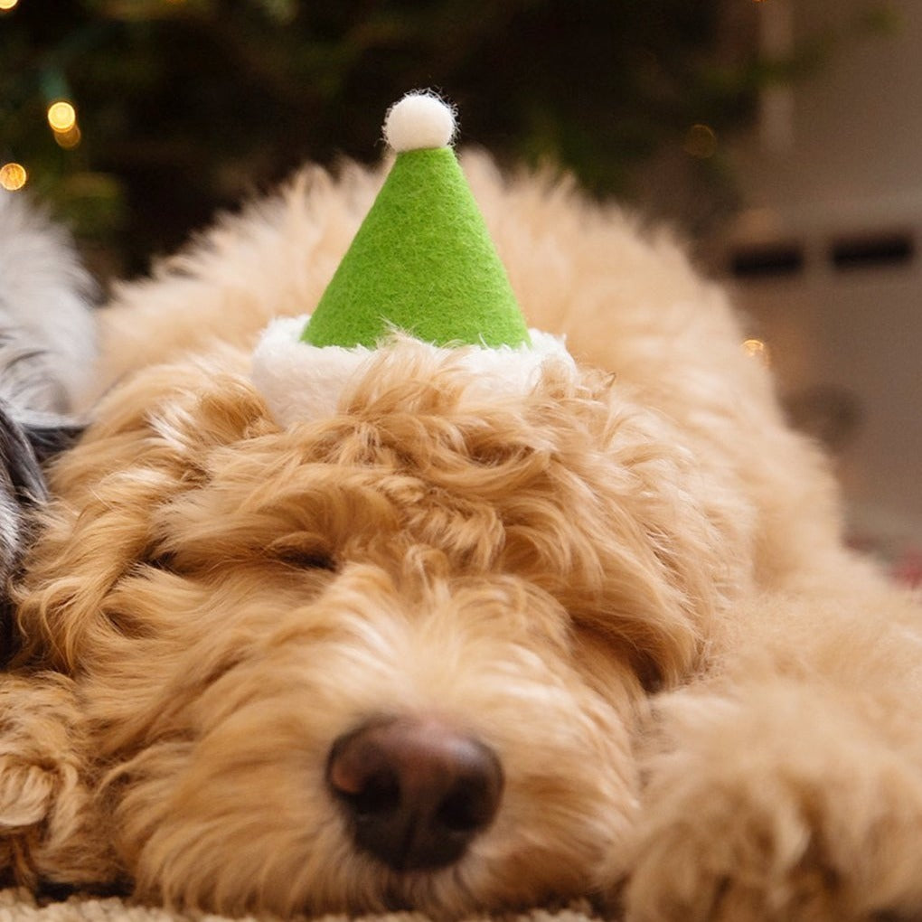 It was the night before Christmas when the cameras and phones were snapping, because the beasts were in place as grandpa lay napping. One beast in a Santa Hat, another in an Elf, the most adorable holiday photo captured, if I do say so myself. Each holiday hat is handmade with holiday joy from 100% wool felt and ball - finished with classic holiday faux fur. Adjustable elastic strap can be shortened and knotted for the little beasts among us. Made in USA with love.