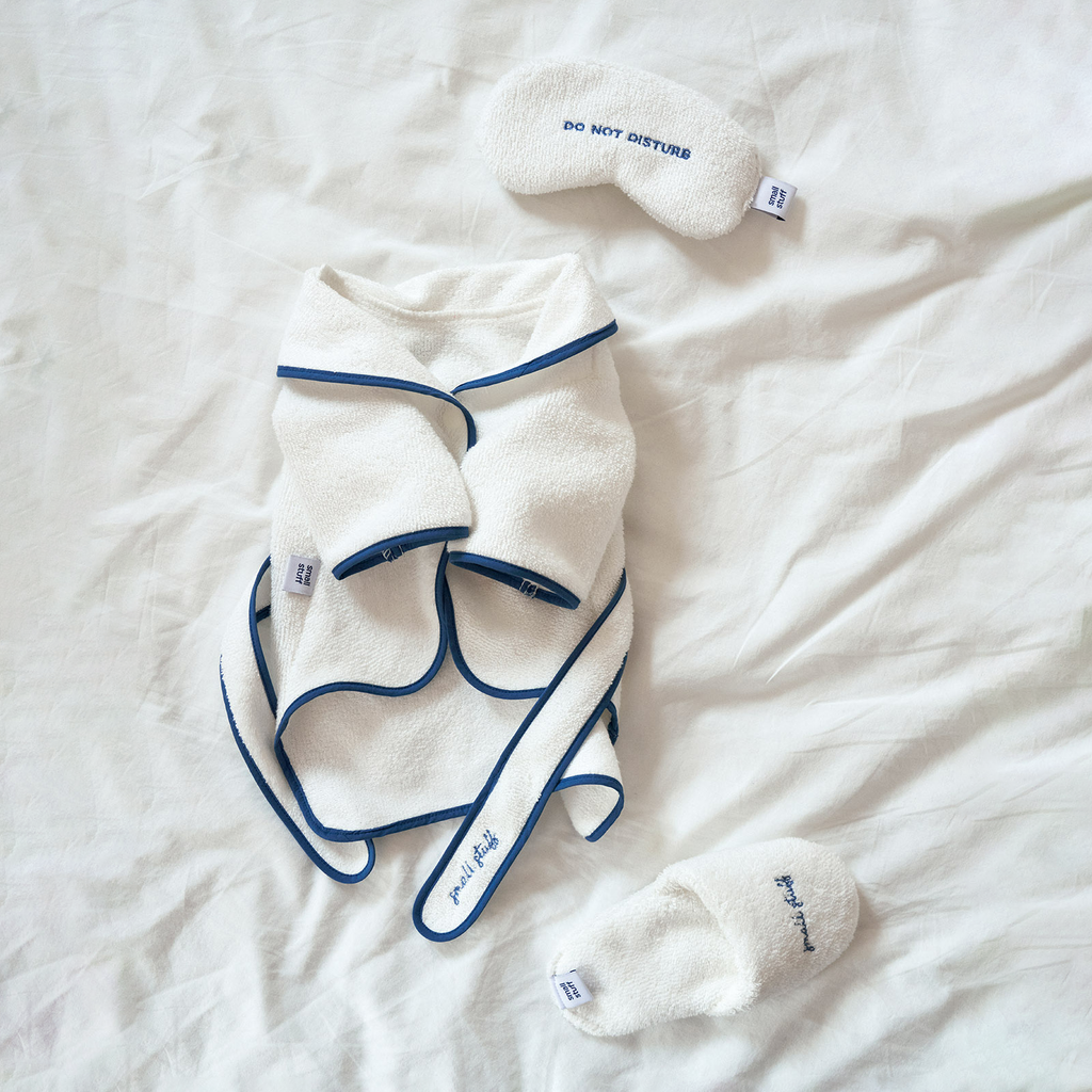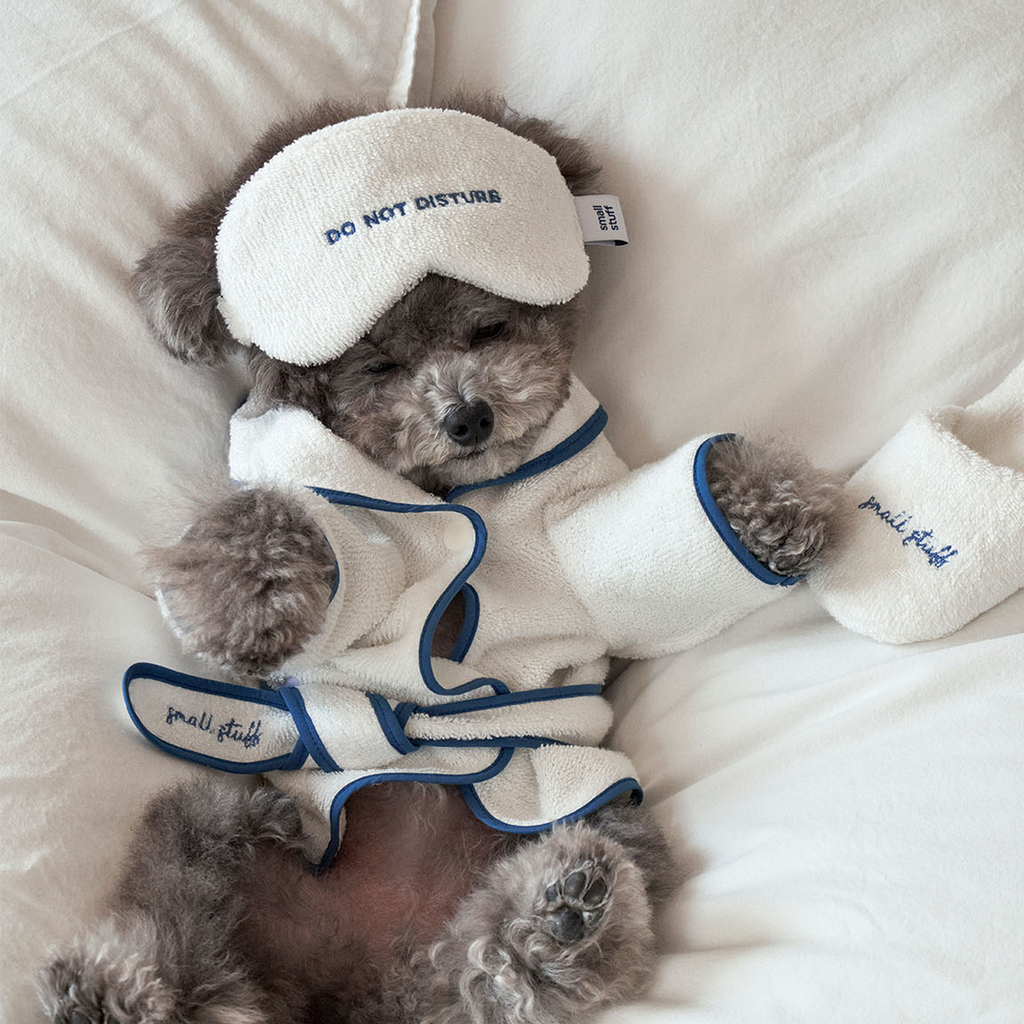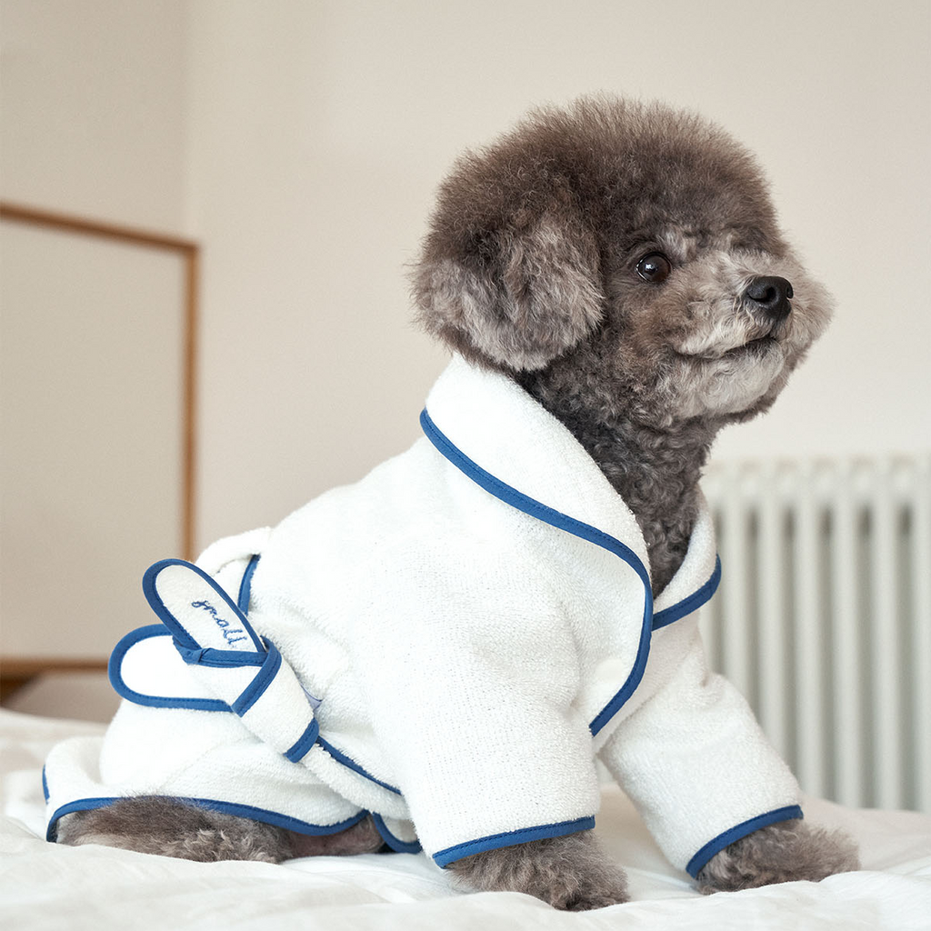Specifically designed for smaller sized dogs and you can adjust it with a waistband for better fit. The bath robe has a toned down blue point line, and the waist strap is finished with a Small Stuff embroidery. There's a snap on the chest that fixes it to prevent it from loosening and making it convenient to wear and take off.